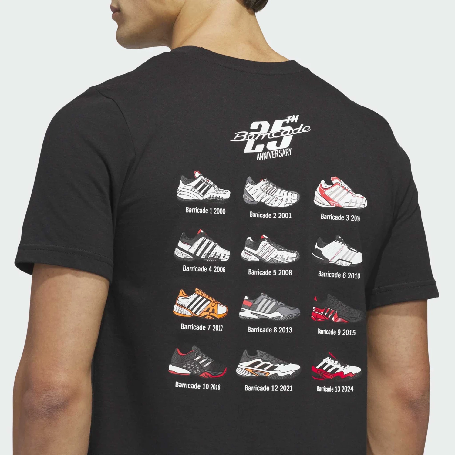 Celebrate a legacy of comfort and stability with the adidas Barricade 25th Anniversary Tee! This graphic tee features CLIMACOOL technology to keep you dry on and off the court. Its eye-catching graphic on the back honors the evolution of these iconic shoes, from the first version to the current model. On the front, an adidas logo and 25th Barricade Anniversary logo celebrate the legendary series.
