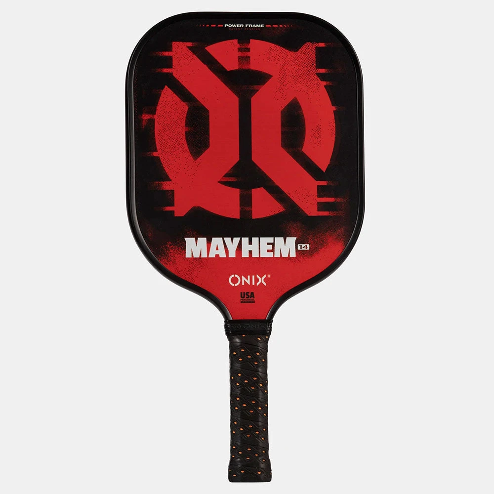 Enjoy great feel and control with the Onix Mayhem 14! Engineered to give you an edge, this pickleball paddle features a carbon fiber Power Frame for extra strength during rigorous play. Enjoy excellent comfort and vibration dampening from the high-density foam handle. The polypropylene honeycomb core provides better touch, power and pop with every swing. If you want unmatched power in a mid-weight package, the Onix Mayhem 14 supports your game!
