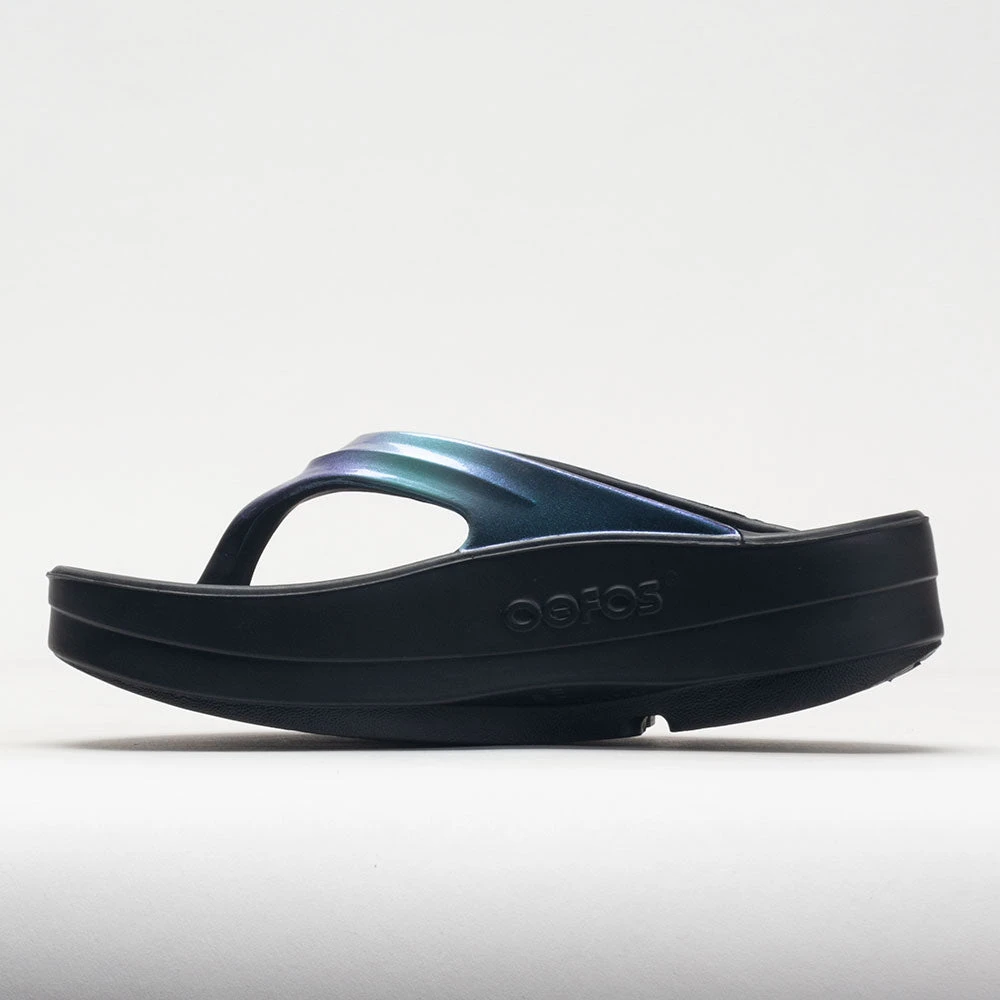 Recover in style with the OOFOS OOmega OOlala Luxe sandals! These recovery flip-flops offer a versatile, modern take on the original OOlala sandals. Featuring the same OOfoam™ technology and patented footbed, the OOmega includes a MEGA midsole that adds 15mm of shock-absorbing comfort. Vibrant treatments and prints add a colorful twist to the classic silhouette. Trendy and unique, the OOFOS OOmega OOlala Luxe takes a step forward in fashion and recovery!