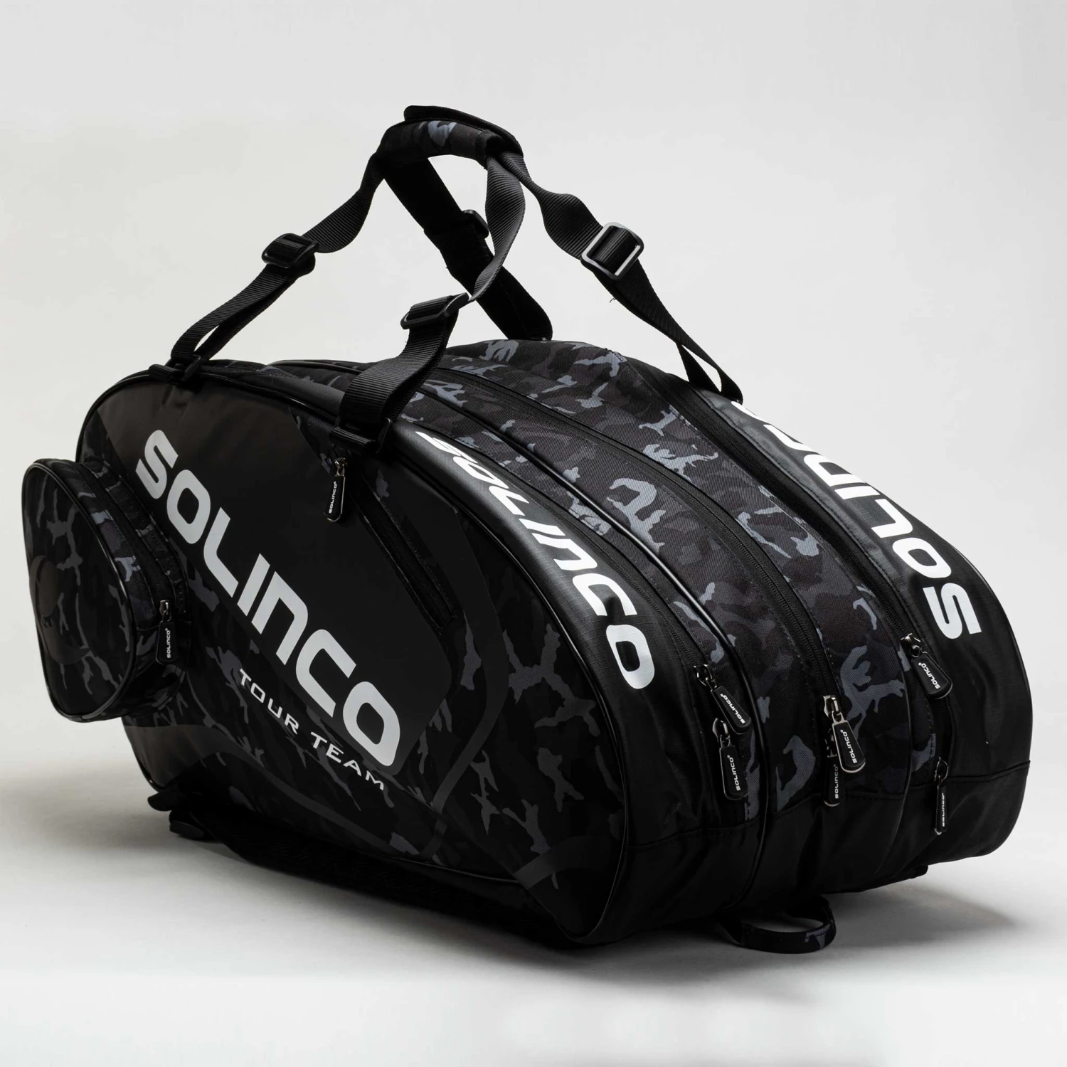 The Solinco Tour 15-Pack Black Camo tennis bag provides ample space for up to 15 of your favorite tennis racquets. Three large main compartments organize your essentials, with two outside sections that offer protection from extreme temperatures. Professional and amateur tennis players will appreciate this tennis bag’s durable material and vibrant style.