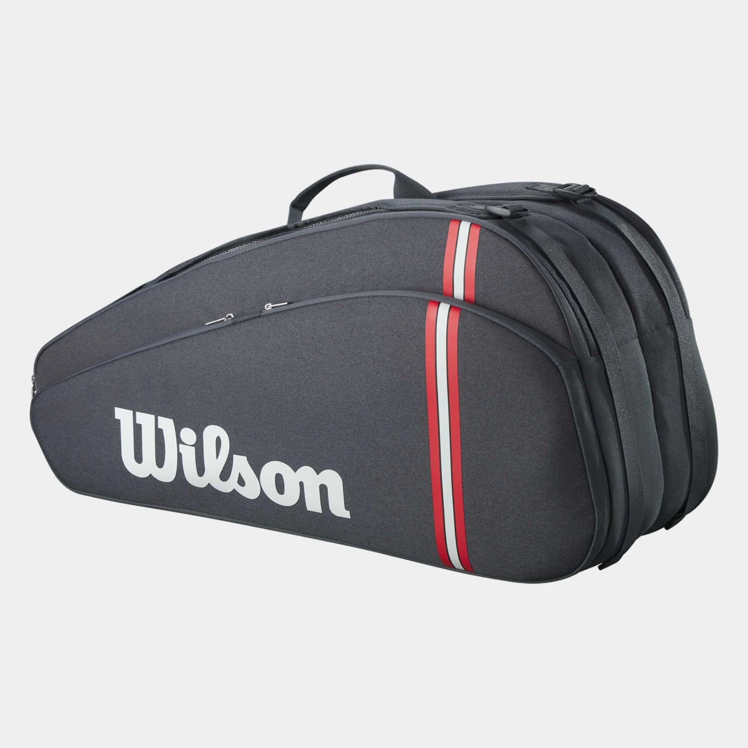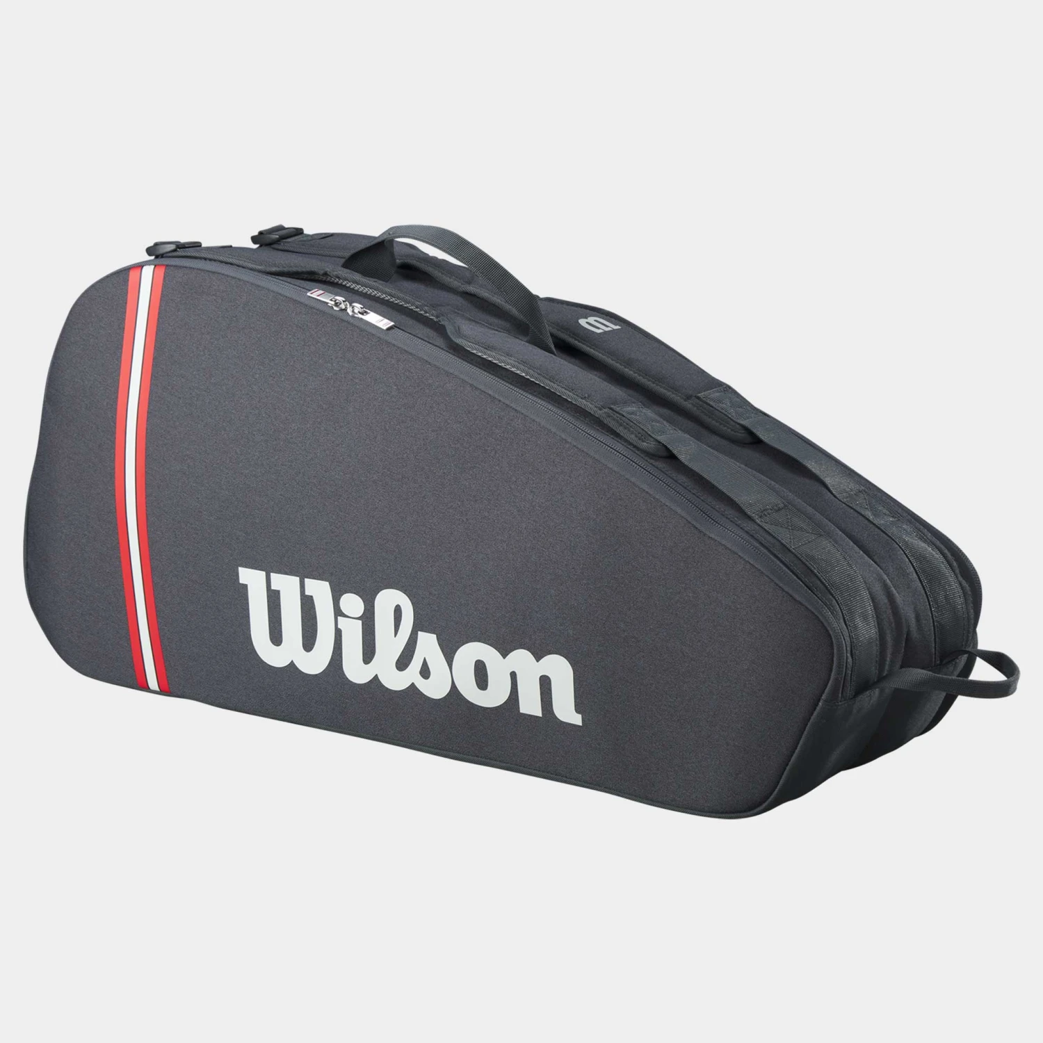 Designed for players and coaches carrying multiple racquets and other gear, the Wilson Tour 6 Pack Racquet Bag features a sleek and modern design. Hold up to six racquets in the two main compartments, plus apparel, shoes and other tennis accessories. One large external pocket holds smaller personal items and valuables. Carry by hand using the top grab handle or the ergonomic, adjustable shoulder straps that improve comfort.